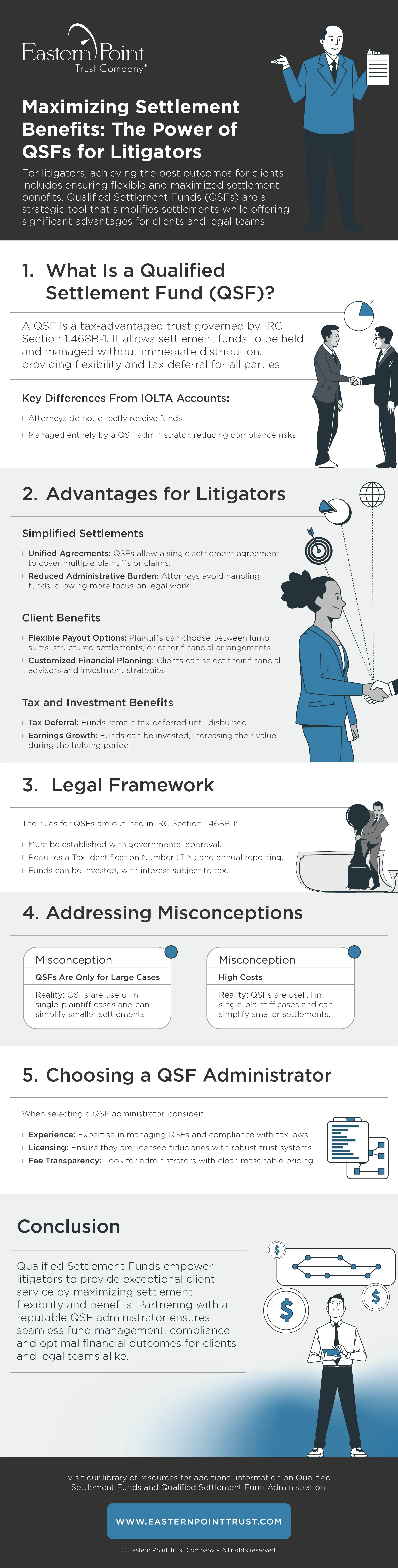 For litigators, Qualified Settlement Funds (QSFs) can achieve the best outcomes for clients including ensuring flexible and maximized settlement benefits.